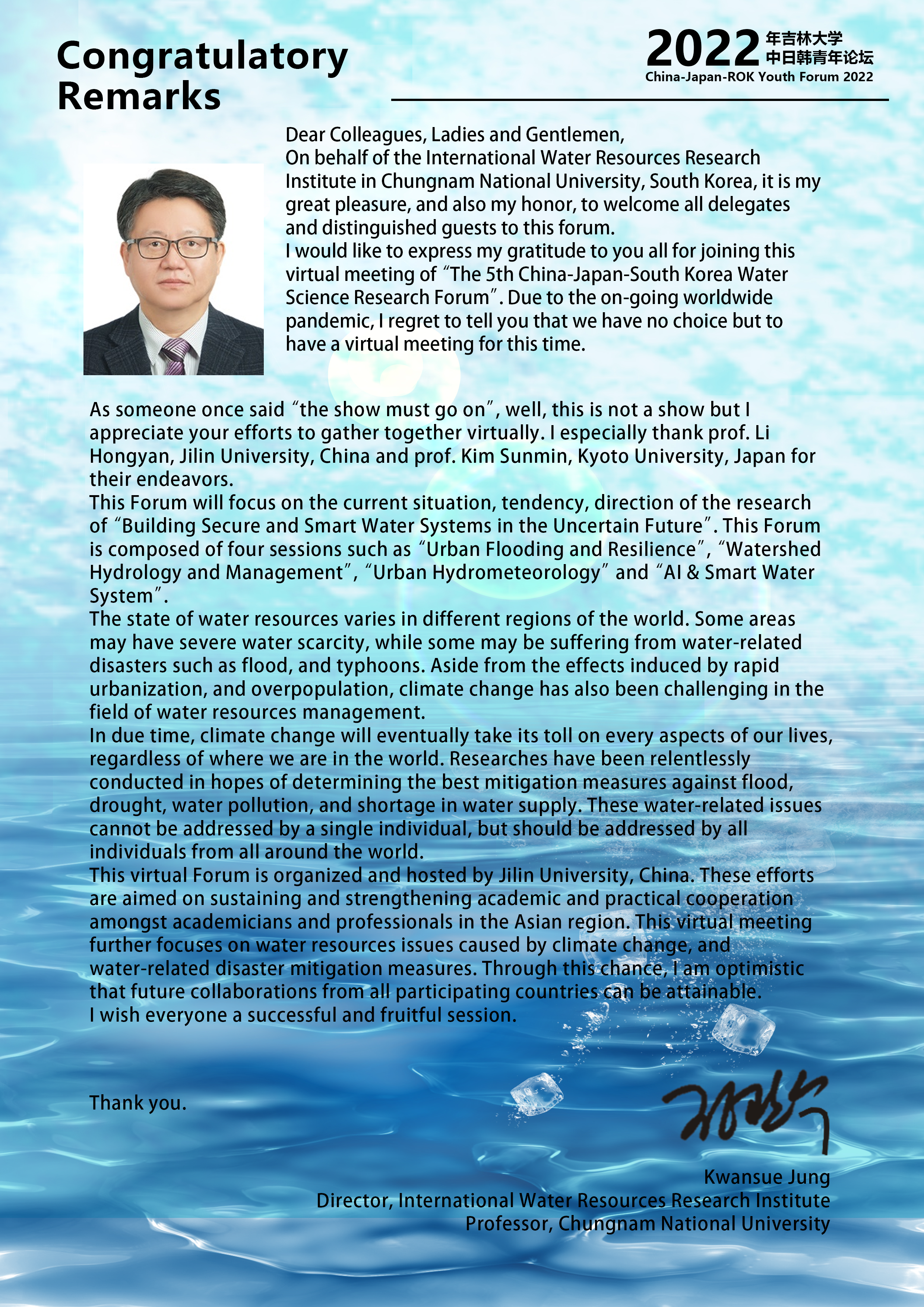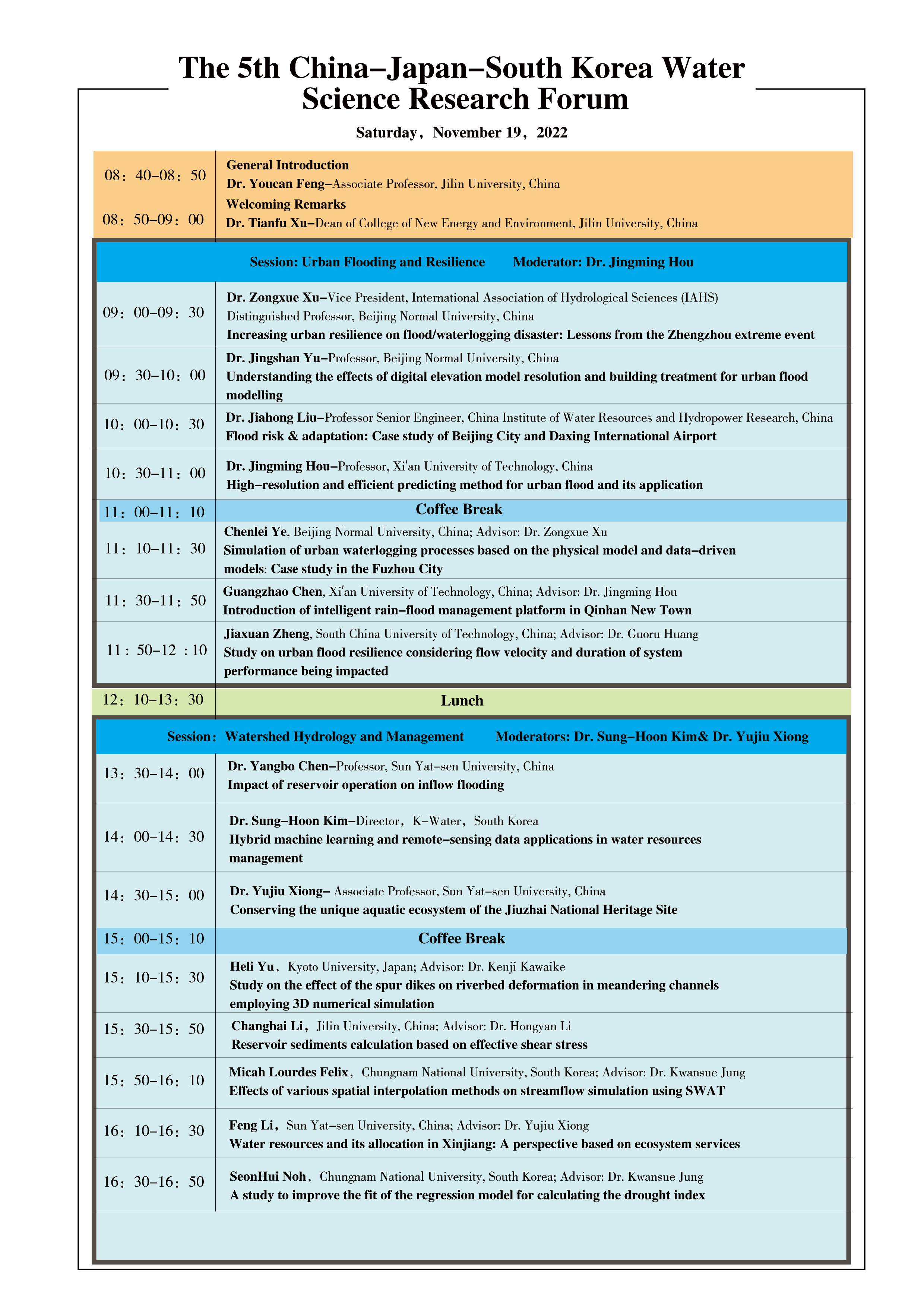 The 5th China-Japan-South Korea Water Science Research Forum, as a part of 2022 China-Japan-South Korea Forum of Jilin University, will be held online by the College of New Energy and Environment at Jilin University on November 19-20, 2022.