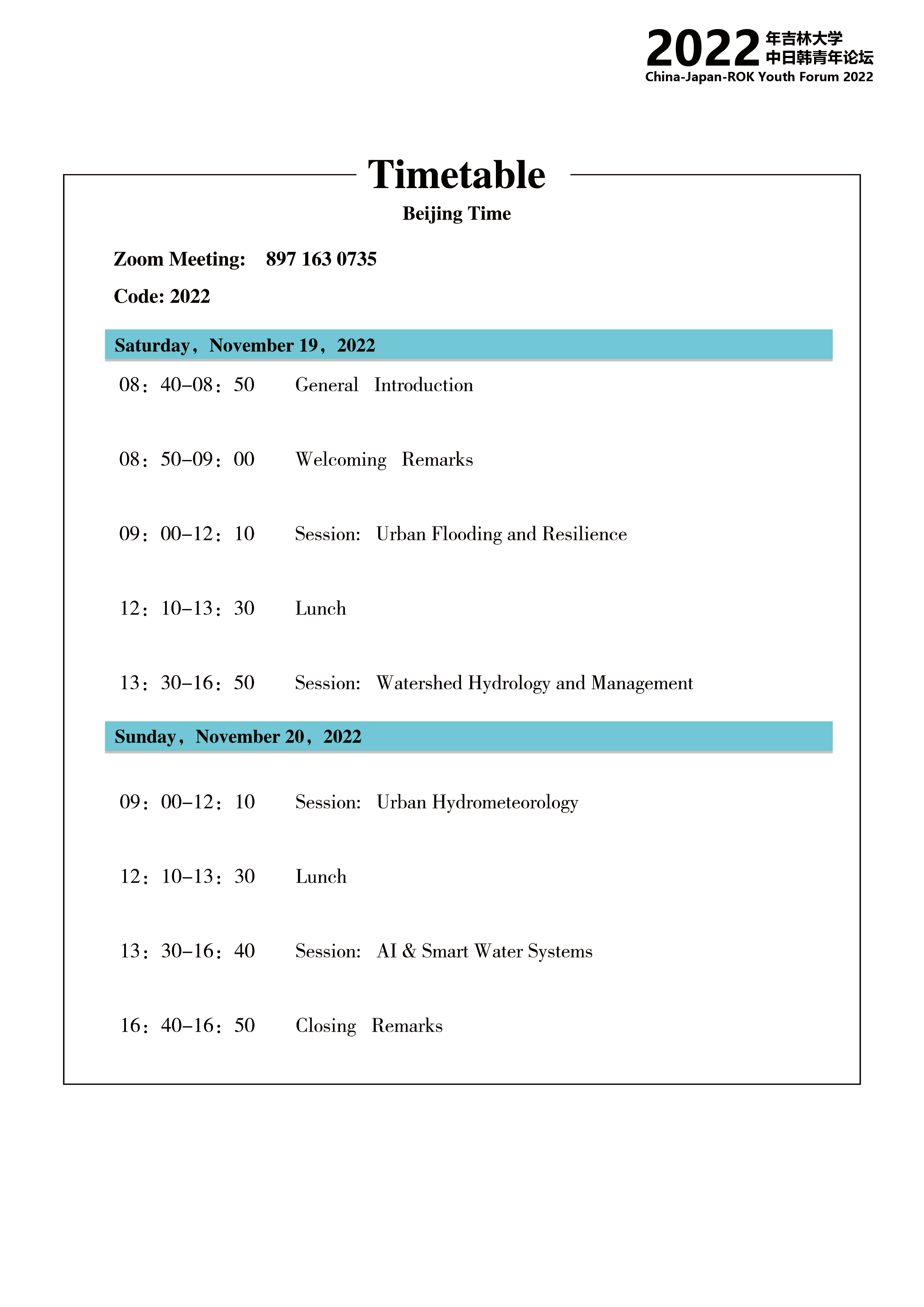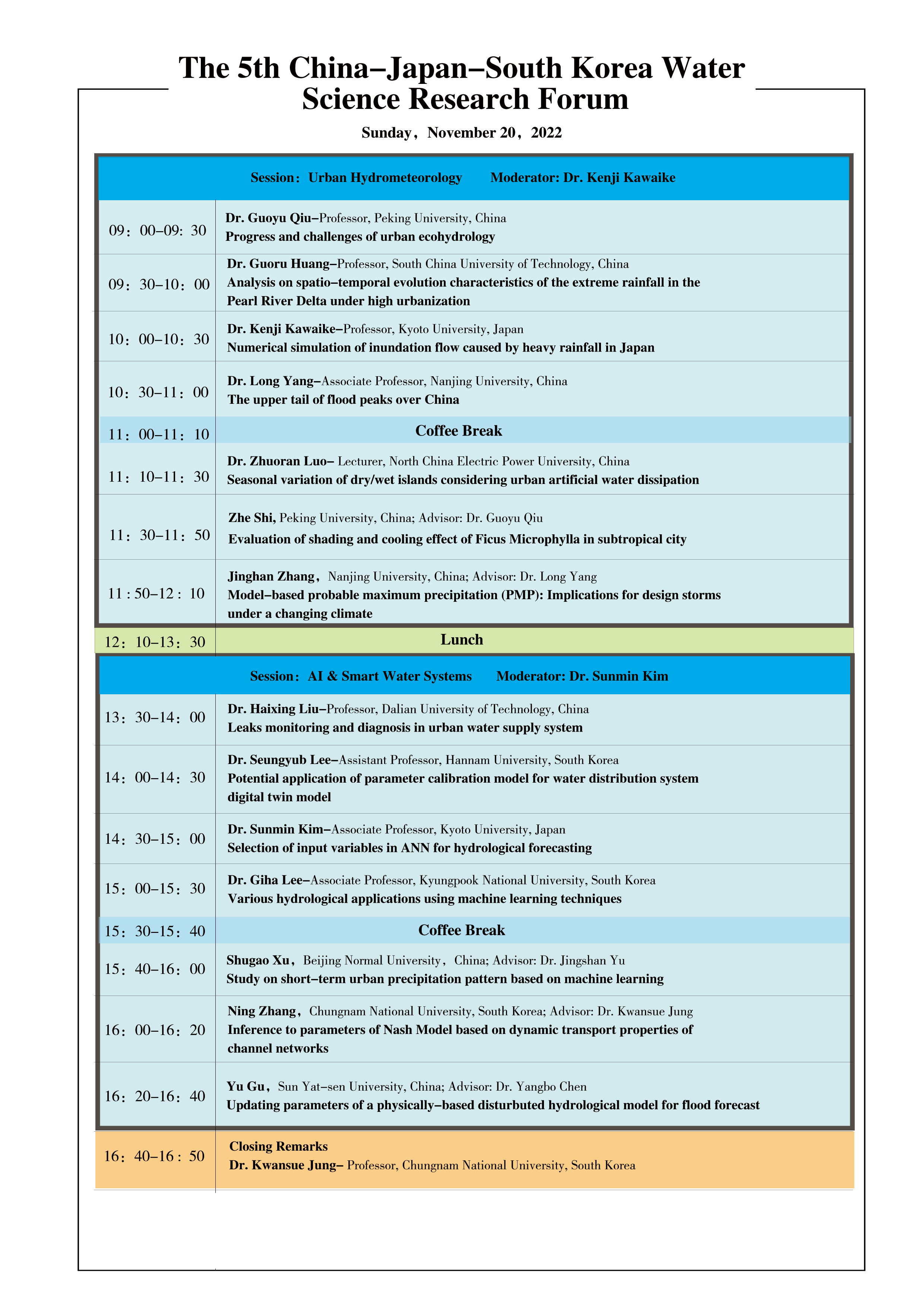 The theme of this year is “Building Secure and Smart Water Systems in the Uncertain Future”, with four sessions as “Urban Flooding and Resilience”, “Watershed Hydrology and Management”, “Urban Hydrometeorology”, and “AI and Smart Water Systems”. We hope that this two-day forum could serve as a broad platform for sharing and discussing the regional research advances in water science, and could also maintain the bridge of friendship through the pandemic that connects talented young scientists from the three countries.