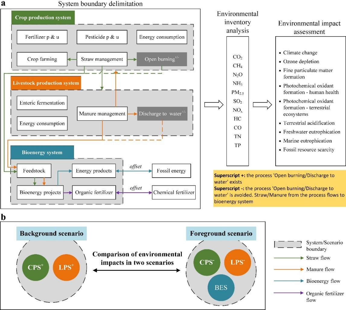 While large-scale and intensive crop and livestock production activities are essential for food security, they also lead to greenhouse gas emissions, nitrogen and phosphorus losses, fossil energy consumption and air pollutant emissions. All of these activities have aggravated the environmental impacts of agriculture. As by-products of the crop production system (CPS) and livestock production system (LPS), straw and animal manure can be used for bioenergy production, which makes it possible to establish an integrated crop-livestock-bioenergy system. Yet, it remains to be studied whether and to what extent this system could indeed mitigate the various environmental impacts of CPS and LPS.