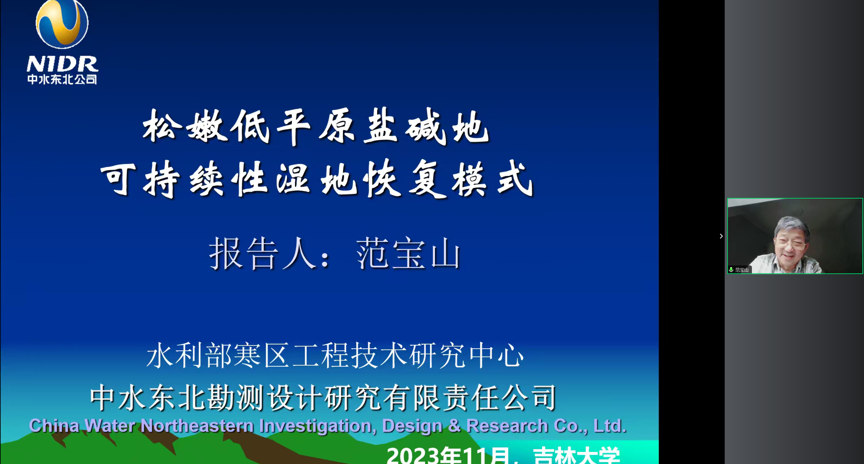 2023年11月23日,中水东北勘测设计研究有限责任公司科学研究院、水利部寒区工程技术研究中心原总工范宝山正高级工程师应邀,就“松嫩低平原盐碱地可持续性湿地恢复模式”这一主题进行了精彩的学术报告。报告会由公司太阳集团122cc水文与水资源工程系主任李鸿雁教授主持,到会人数近百人。