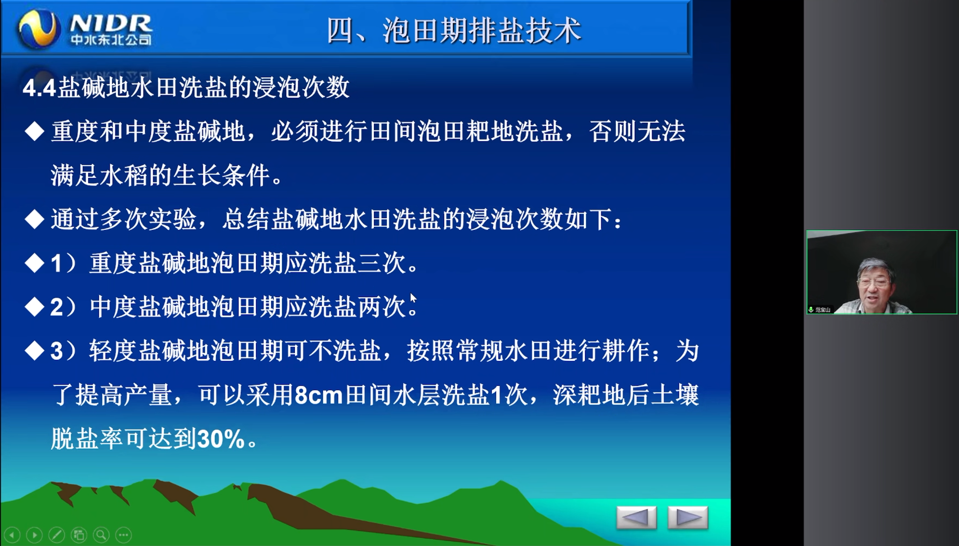 范宝山总工还介绍了轻、中、重度盐碱地水田实验研究情况,讲述了在泡田期和本田期采用的灌溉制度,并强调了控制土壤中盐碱垂向运动的重要性。通过分享实践经验向听众传授了盐碱地水田建设的关键技术和策略。