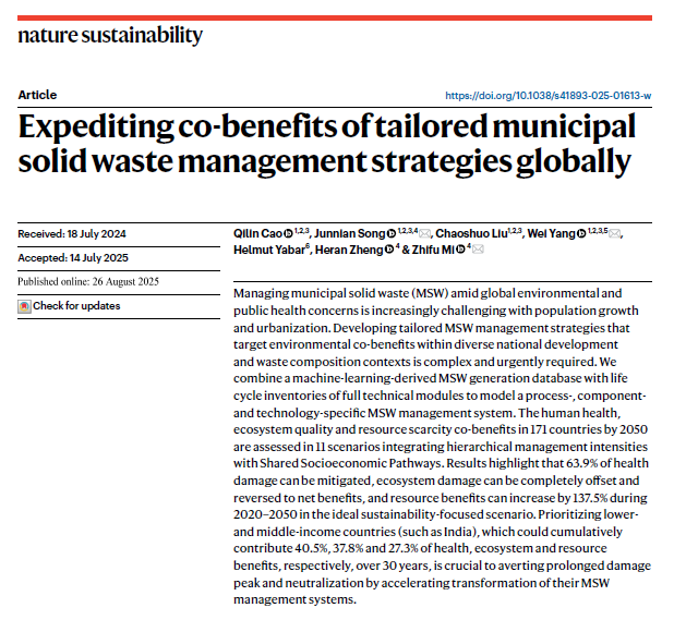 近日,太阳集团122cc宋俊年教授、杨巍副教授领衔的“食物农业生物质(FAB)”研究团队在城市固废可持续管理领域取得突破性成果,以“Expediting co-benefits of tailored municipal solid waste management strategies globally”为题在《Nature Sustainability》发表研究长文。博士生曹琪林为论文唯一第一作者,宋俊年教授、杨巍副教授、伦敦大学公司米志付教授为共同通讯作者,太阳集团122cc为第一通讯单位,合作单位包括日本筑波大学与英国伦敦大学公司。这是宋俊年教授团队在CNS子刊层面发表的第二篇成果。
