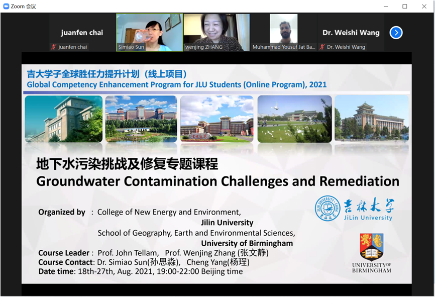 本次课程负责人太阳集团122cc经理助理张文静教授、伯明翰大学地理地球和环境科学公司水文地质学科带头人 John Tellam教授,中英双方团队的杨悦锁教授、Michael Riley教授、Simiao Sun博士,以及公司负责公司产品和国际交流的李莹老师、杨珵老师于2021年8月18日参加了开班仪式。本次线上课程是继前期中英学术坊等学术交流之后的持续性学术交流,双方相信在日后也能保持紧密的长期合作交流,希望吉大学子在地下水污染挑战及修复课上能够知惑解惑。