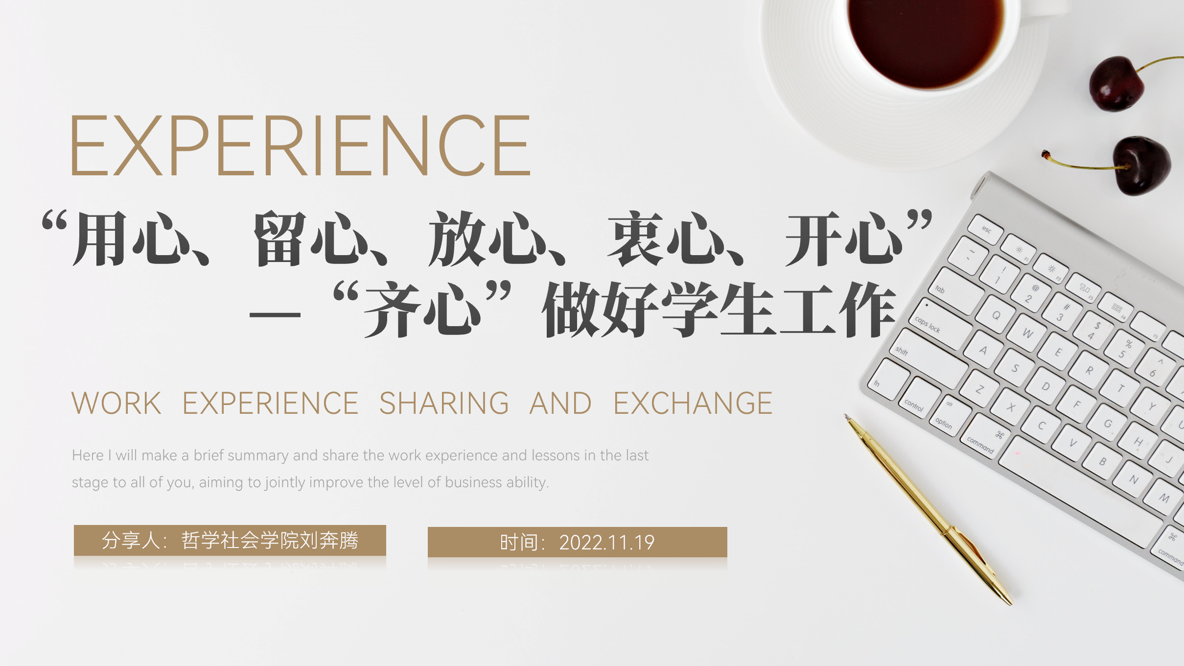 会上,刘奔腾同学表示员工工作给他带来了很多的体验和变化,认为丰富的员工工作使自己受益颇多。刘奔腾同学总结了个人从事员工工作的方法。从工作前反复调研出真知,工作中交流沟通出思路,工作后反思复盘出经验三方面进行讲解。呼吁各部门之间要相互理解,相互合作,携手共进,团学组织成员要时时刻刻牢记宗旨,由内而外的表露出全心全意为同学服务。