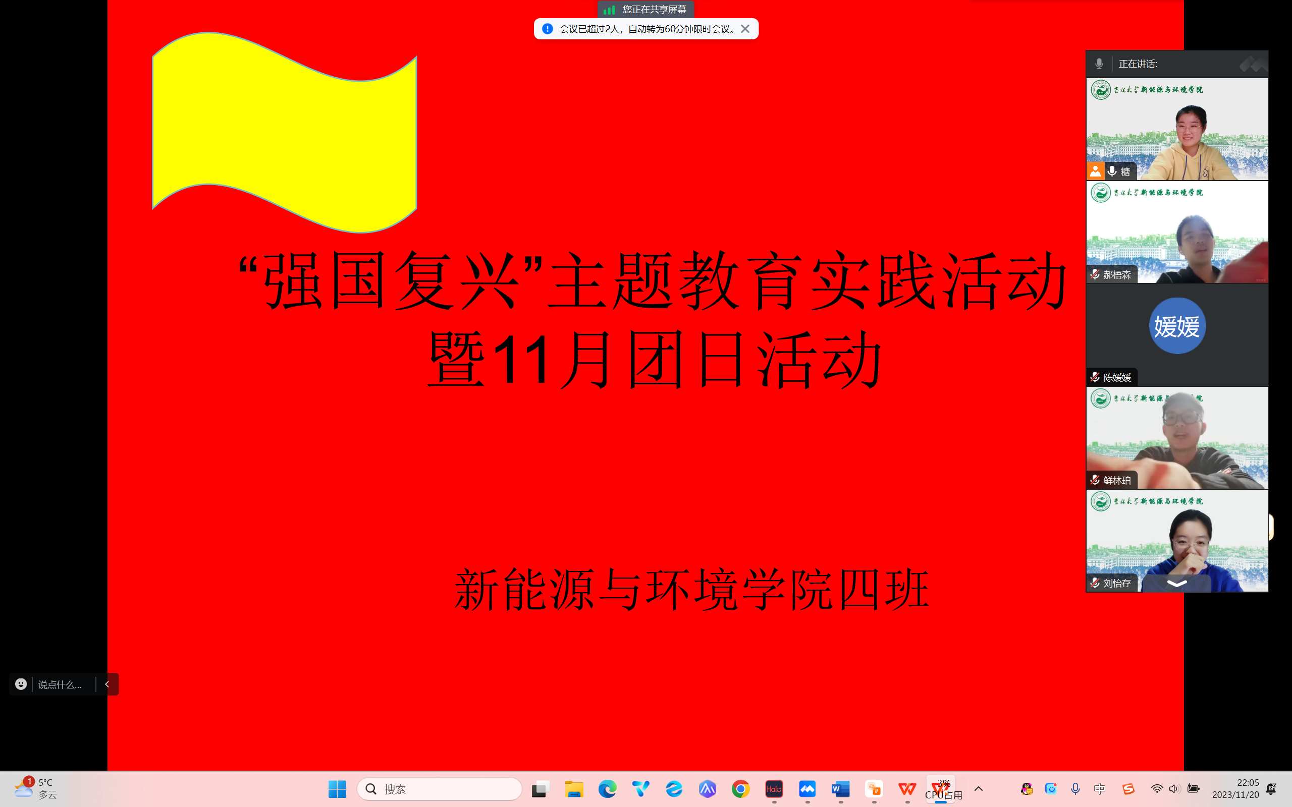党的二十大以来,以习近平同志为核心的党中央高度重视、热情关怀青年、充分信任青年,鲜明的提出了党管青年原则,为深入学习党的二十大关于全面建成社会主义现代化强国,以中国式现代化全面推进中华民族伟大复兴战略和习近平总书记的相关重要论述。太阳集团122cc252304班团支部于十一月二十日晚六点在团支书唐烨的带领下开展“强国复兴”主题团日活动。此次活动共有包括团支部内25名共青团员在内的36位青年参加。
