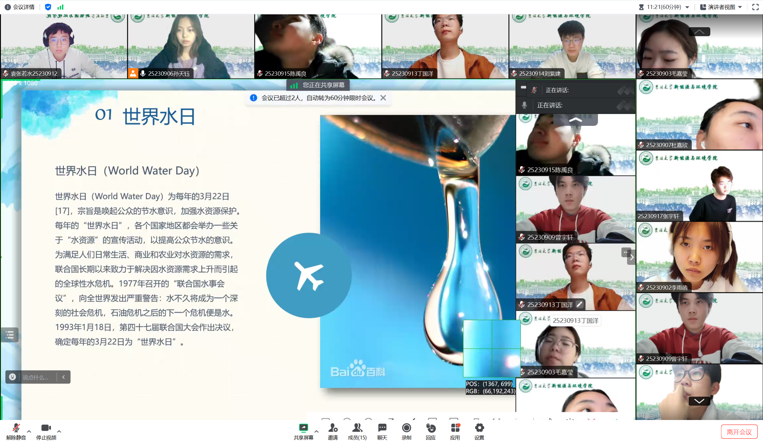 部分团支书带领团支部同学讨论为什么要节约用水,如何节约用水等,阐述节约水资源在中国绿色可持续发展中的重要性。同学们就中国绿色可持续发展的政策已经水资源规划与管理进行了思考与讨论。