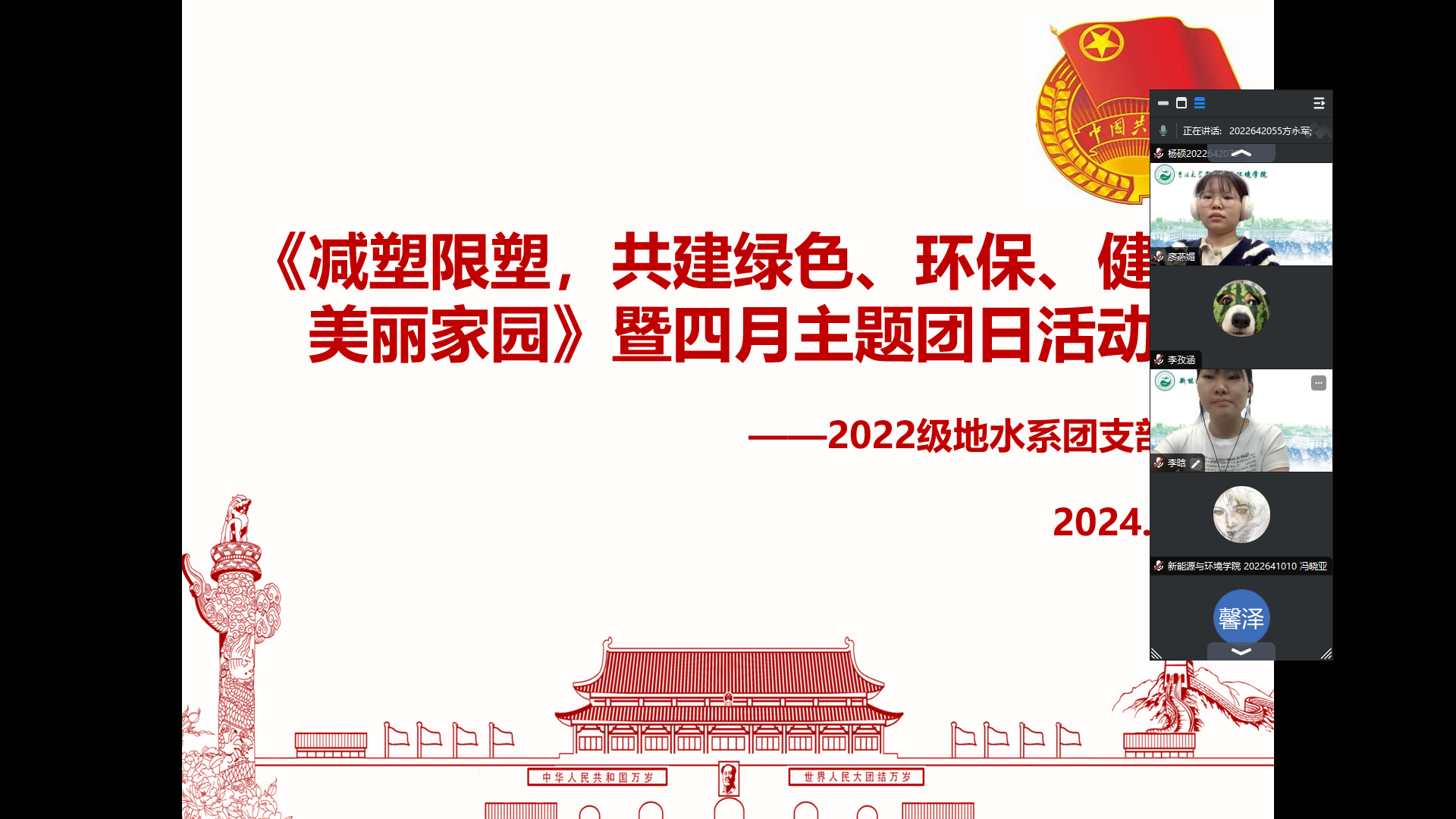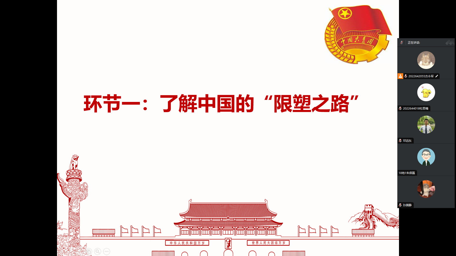 首先,团支部书记播放了由CGTN发布的《中国的“限塑之路”》视频。通过观看视频大家了解到,自1950年至2015年,全球人类共生产了83亿吨塑料制品,其中79%的塑料垃圾被丢弃,12%被焚烧,仅有9%的塑料垃圾被回收再利用。而中国是全球最大的塑料生产国,同时也是塑料制品消费大国。这些塑料垃圾会以微塑料的形式轻易地进入生态系统和食物链中,逐渐累计并严重危害人类的身体健康。但随着中国向一次性塑料宣战,如今国内使用一次性塑料制品的现象大幅减少。虽然“限塑之路”道阻且长,但在全人类的共同努力下终结塑料污染是可以实现的!