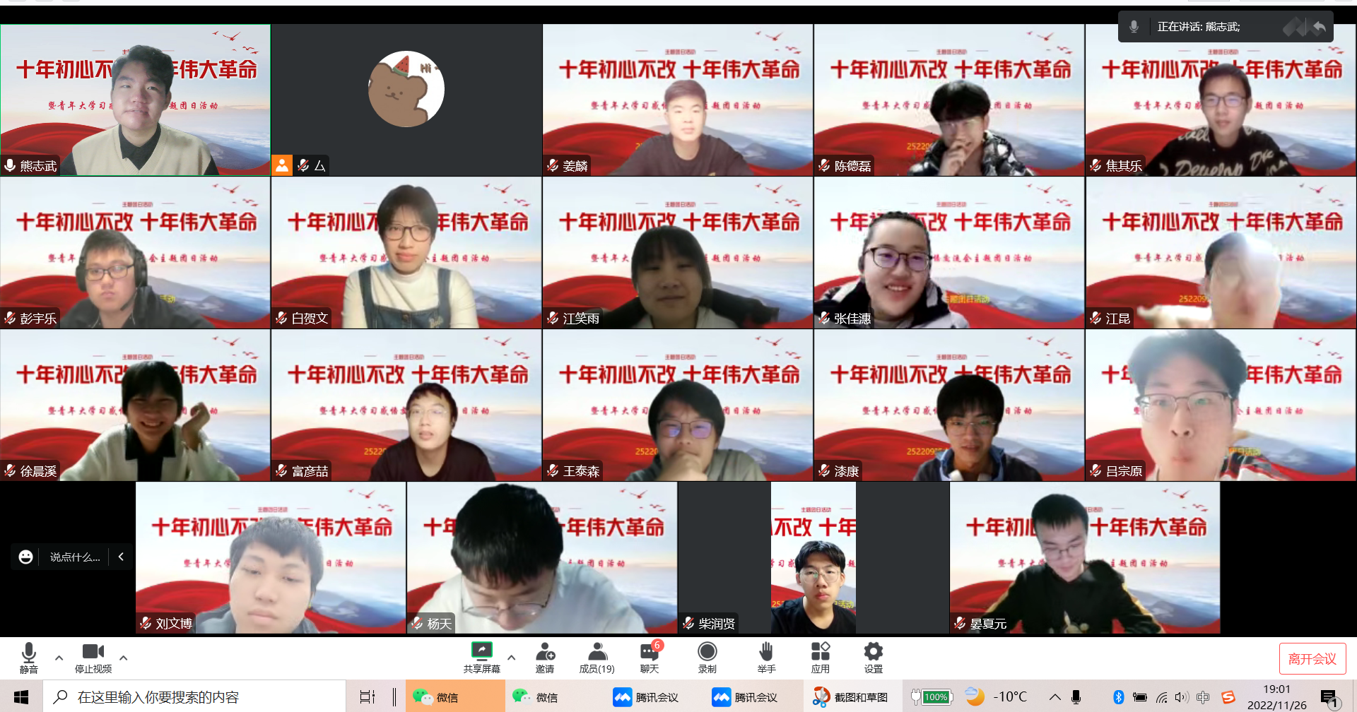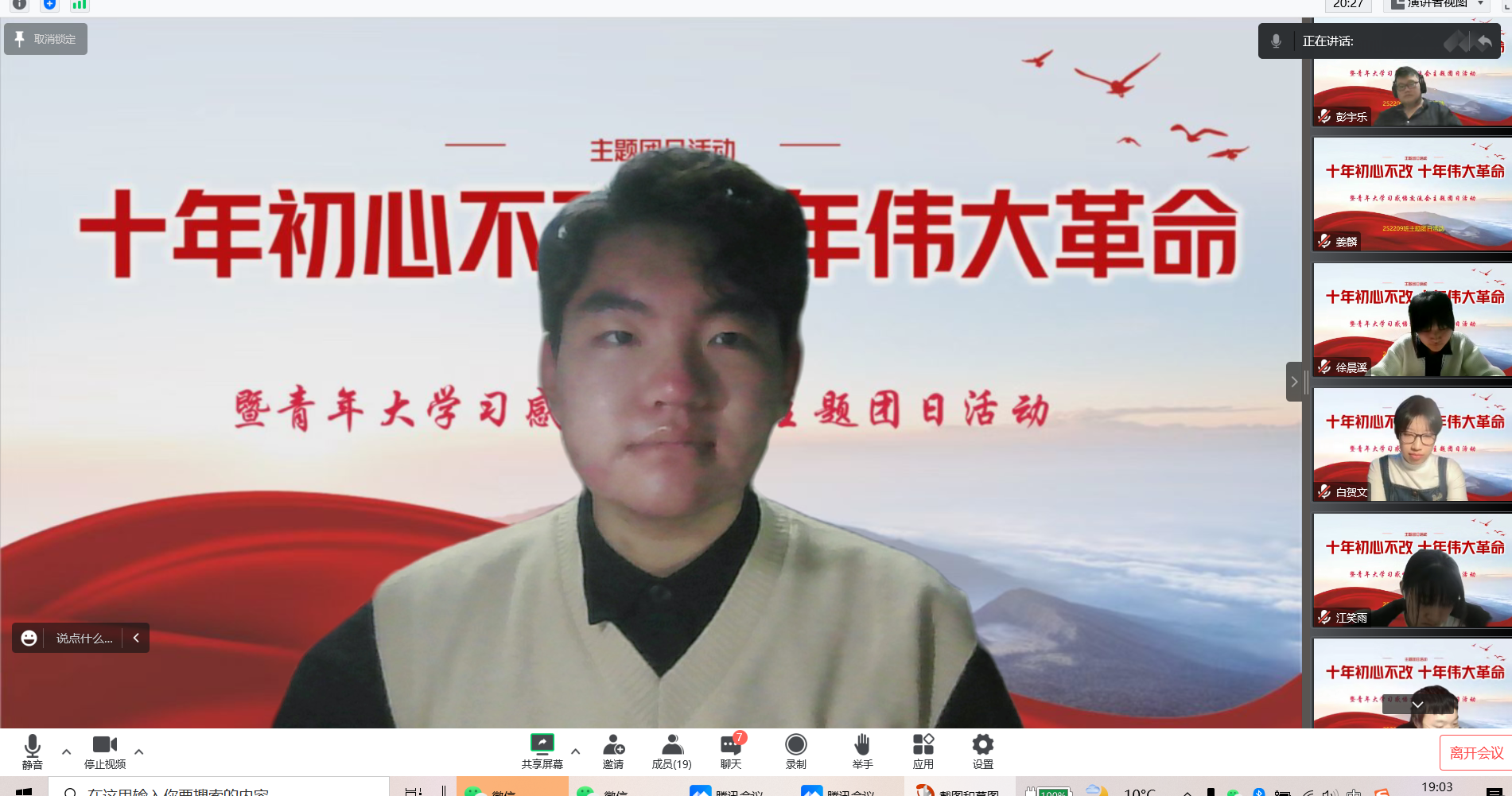 随后,大家共同在腾讯会议上观看了二十大主题云团课,并得到自己的心得体会,通过学习党二十大新思想,青年团员深刻领会了党的二十大的主题,深入理解了新时代中国特色社会主义思想,不忘初心,砥砺向前,同时还学习了党二十大重要意义,强化了思想引领,激发了奋进力量,青年团员在党的引导下坚定理想信念,争做时代新人。青年团员牢记自身责任担当,把理想信念融入自己未来的发展规划之中,坚定不移听党话、跟党走,怀抱梦想又脚踏实地,敢想敢为又善作善战。