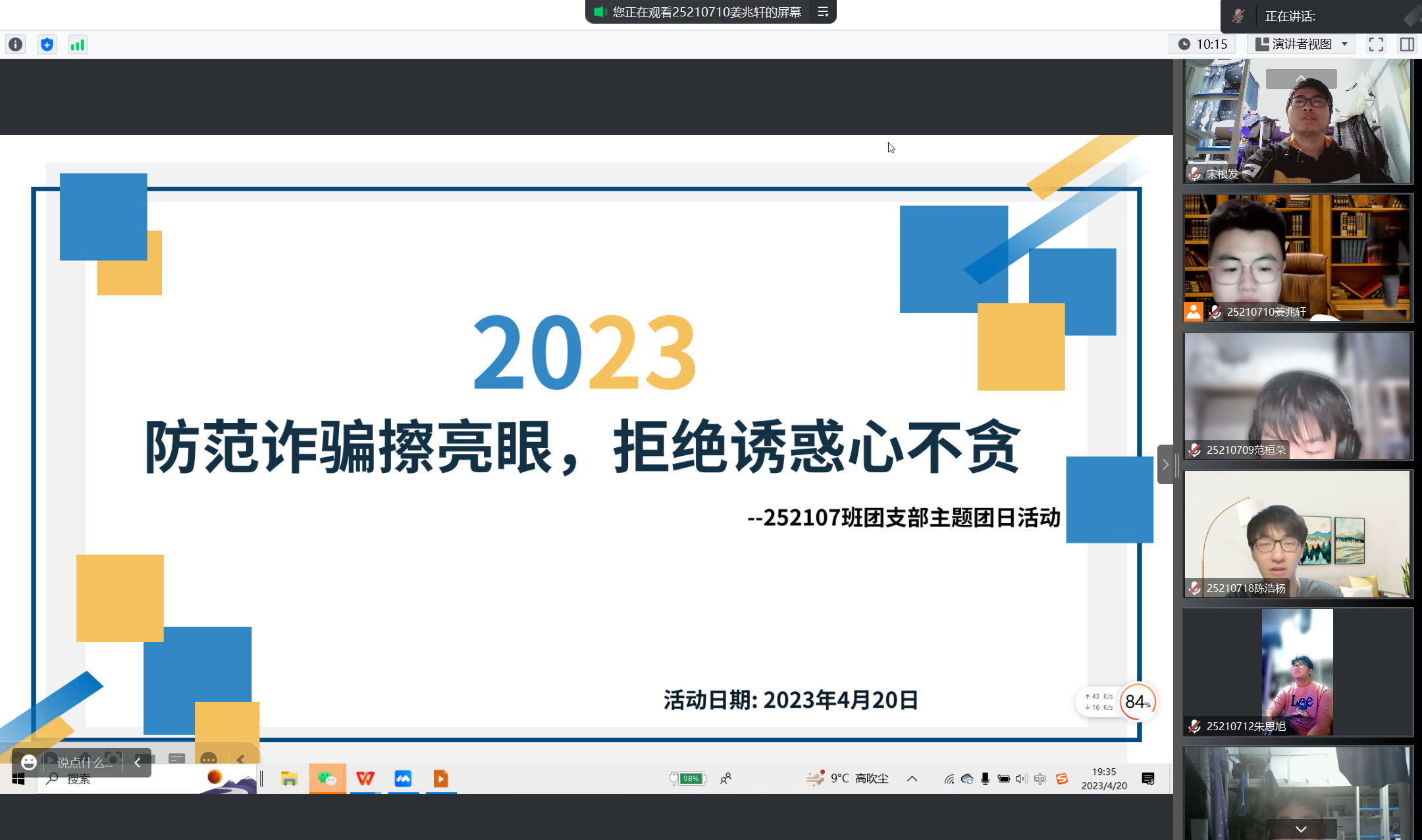 252026班团支书严新月同学引领大家了解了一些常见的诈骗手法和套路,比如假冒官方机构、冒充亲友、利用人们的好奇心和恐惧心理进行诈骗等等,呼吁大家保持警惕,提高防骗意识,远离这些陷阱。同时也分享了一些防范诈骗的经验和方法,如:不在公共网络环境下随意登录银行账号,不随意透露个人敏感信息,不相信绝对不可能的高额回报等等。只有大家积极行动、提高警惕,才能有效地减少网络犯罪和诈骗的风险,让生活更加安全和稳定。