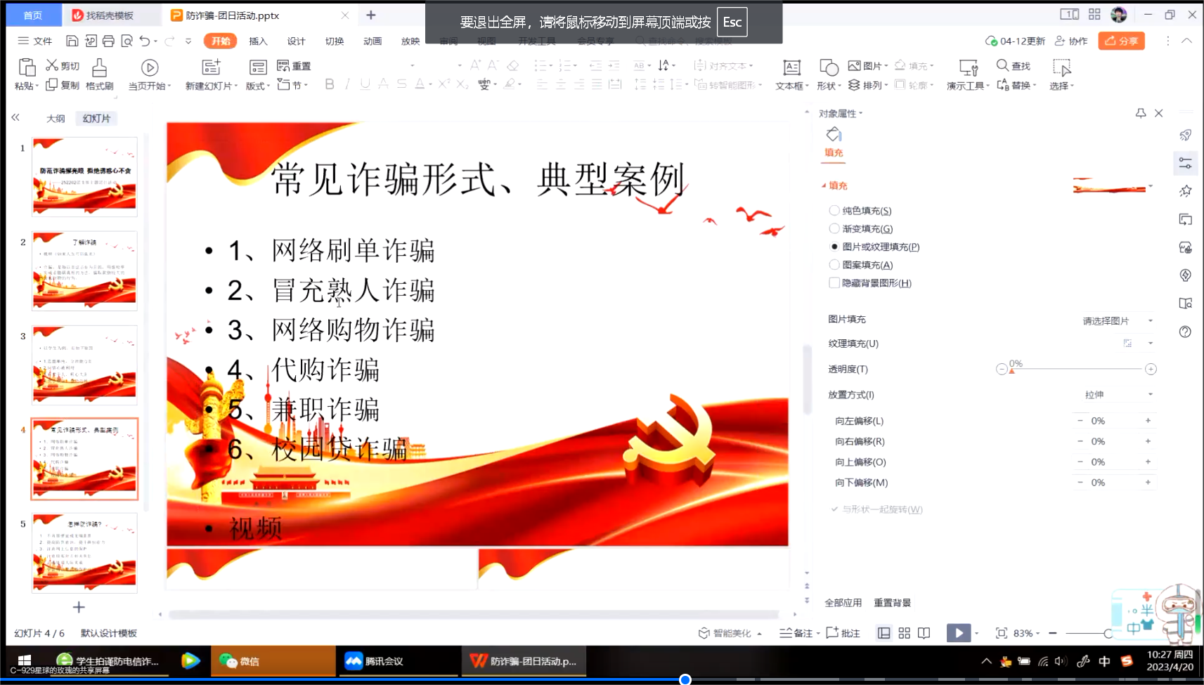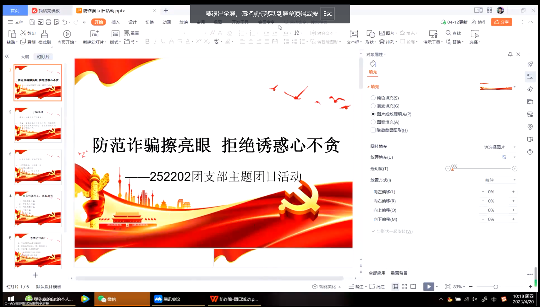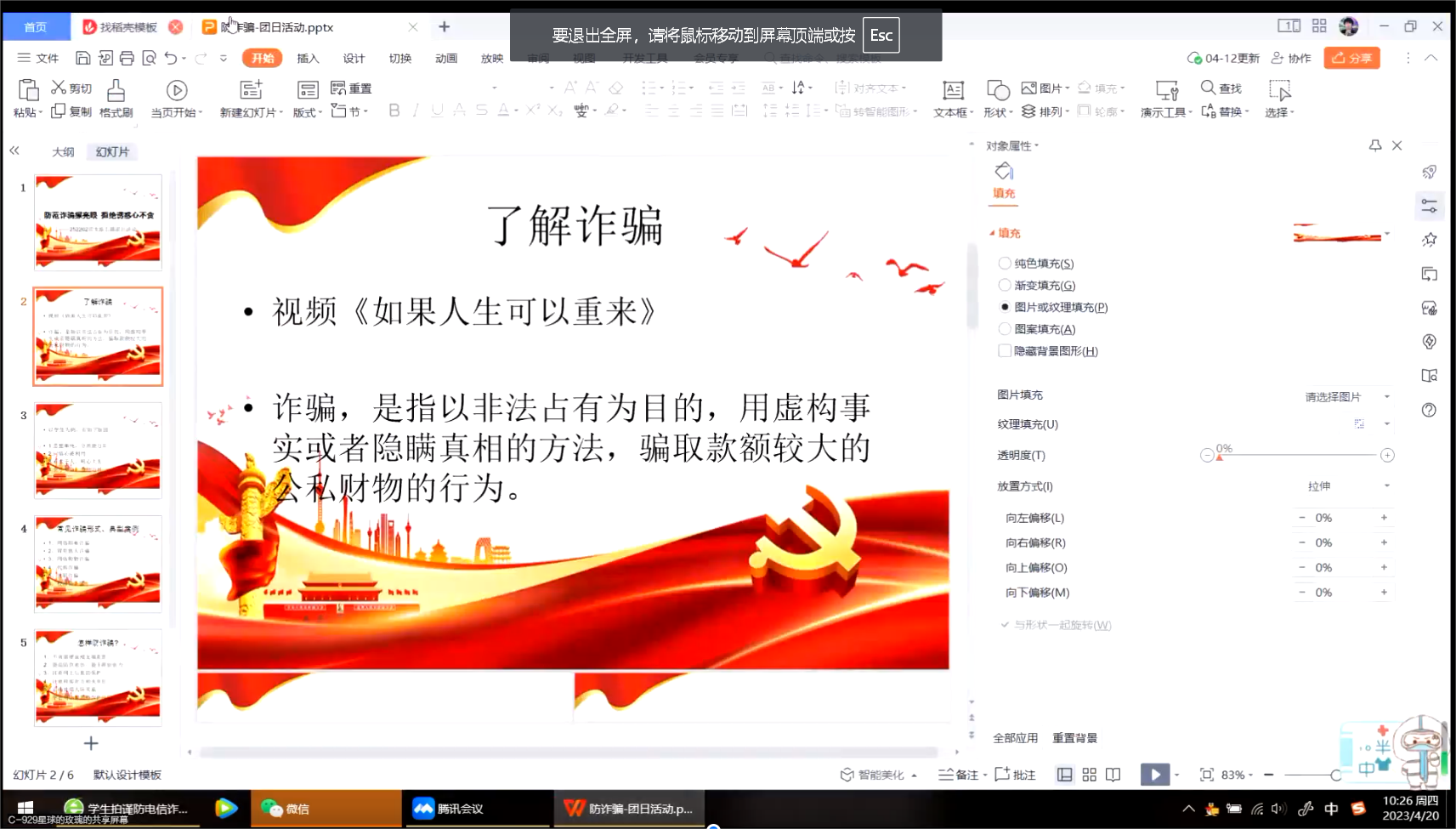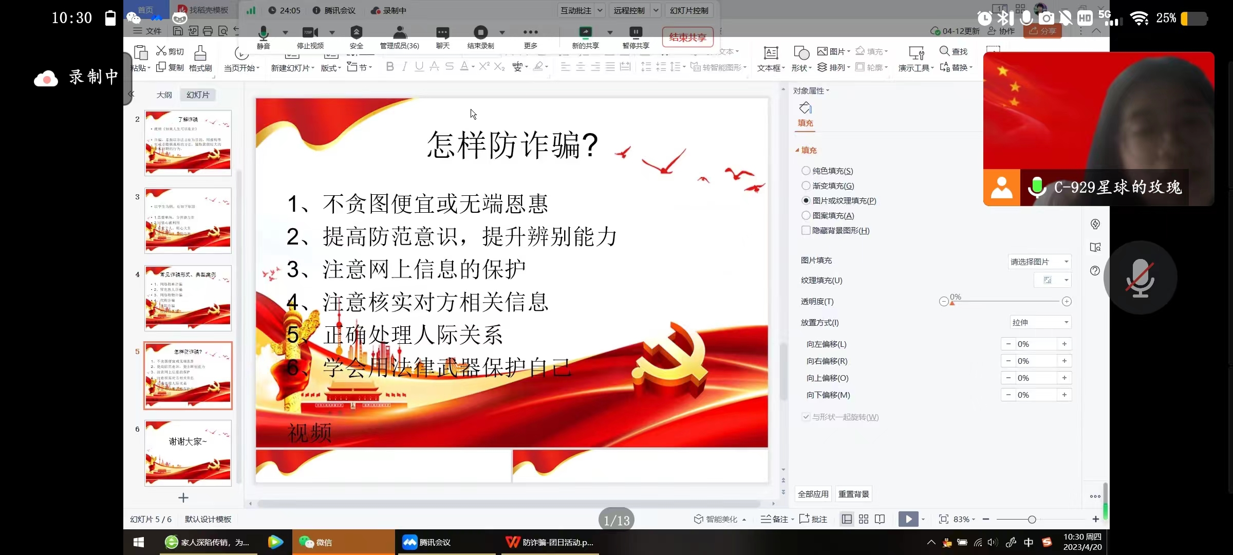 当今社会,电信诈骗案的手段层出不穷。为进一步扩大反诈宣传覆盖面,提高各同学的反诈骗意识、维护大家的财产安全,太阳集团122cc252202班团支部于4月20日上午十点在团支书郭诗语的带领下,于线上开展“防范诈骗擦亮眼 拒绝诱惑心不贪”反电信网络诈骗宣传教育主题团日活动。本次团日活动共有包括支部内29名共青团员在内的34位青年参加。