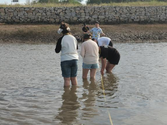下午同学们进行土壤剖面采样实习后,随老师来到东沙河大桥进行河流流量测量并下水进行水生生物采样实习,返回基地后各组同学对捕捞到的水生生物进行观察和辨别。