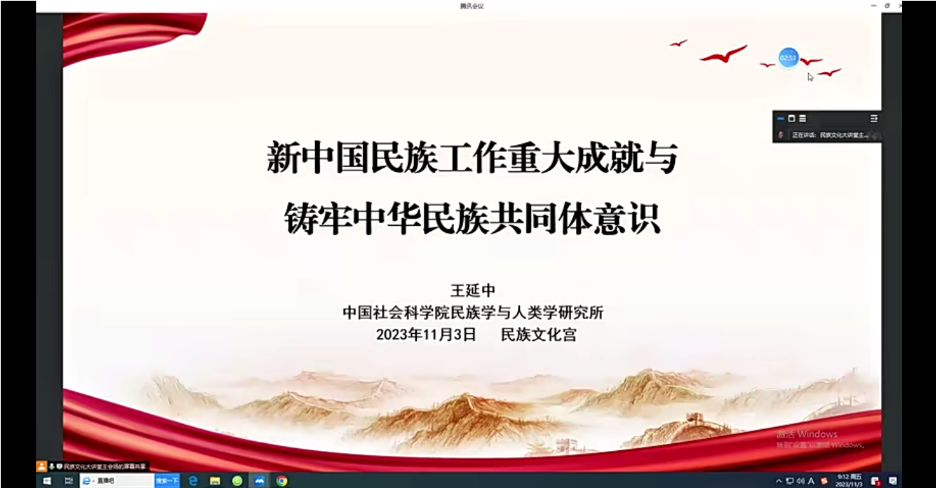 为深入学习贯彻习近平总书记关于铸牢中华民族共同体意识重要讲话精神,推动铸牢中华民族共同体意识的理论与实践体系构建,2023年11月3日上午9点,中国社会科公司民族学与人类学研究所所长王延中同志做客民族文化宫“民族文化大讲堂”,就总书记在中共中央政治局第九次集体学习时的重要讲话精神做《新中国民族工作重大成就与铸牢中华民族共同体意识》专题讲座,太阳集团122cc本科员工第一党支部、第二党支部党员线上参会。