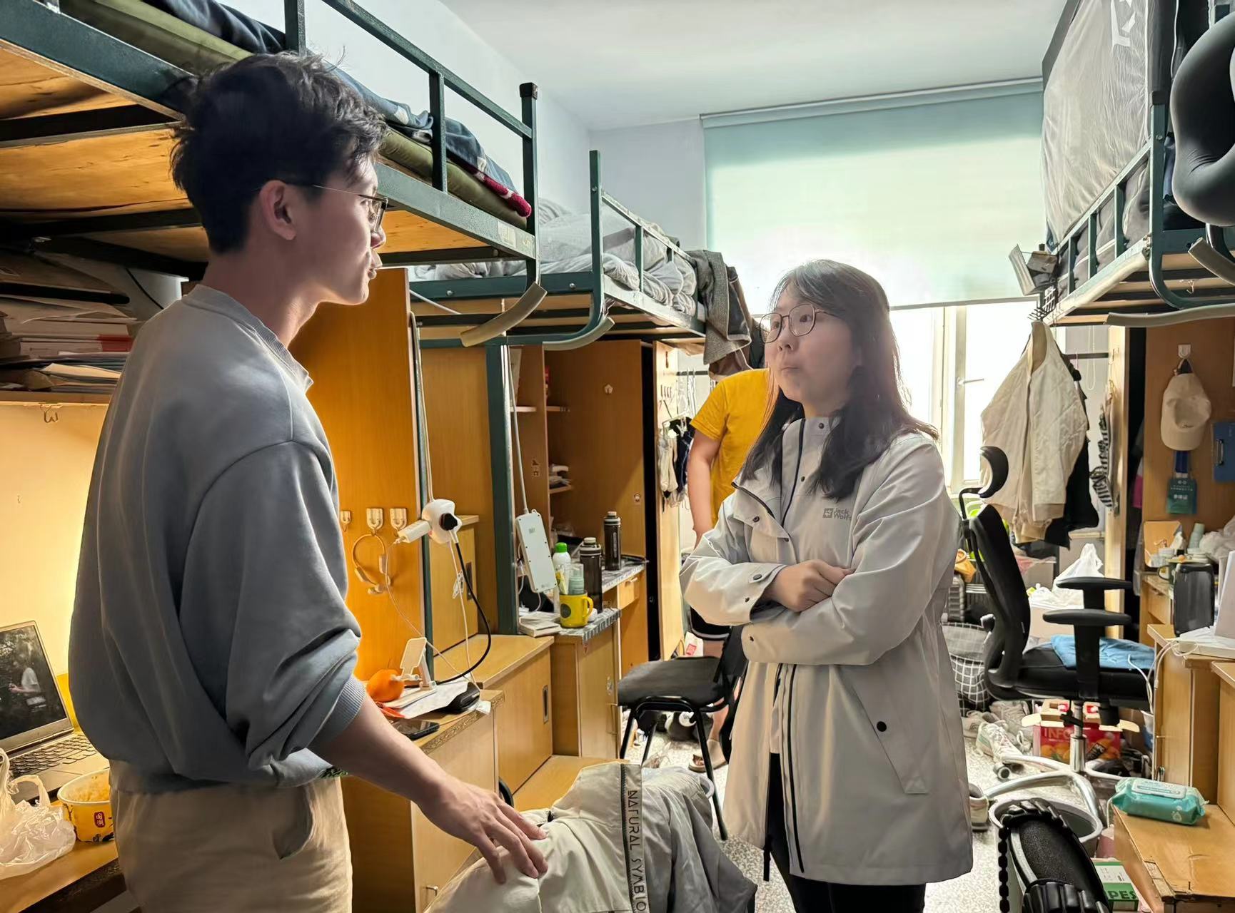 4月27日,2023级辅导员姜岳彤老师对南苑一公寓51间寝室进行走访,关注宿舍卫生、近期员工学习状态,了解同学五一去向,叮嘱同学离寝时注意断电防火。28日,姜老师深入《线性代数B》课堂查课,并同任课老师交流教学进度,本次课程共10人请假,其余88人按时到课,课程整体进度良好。
