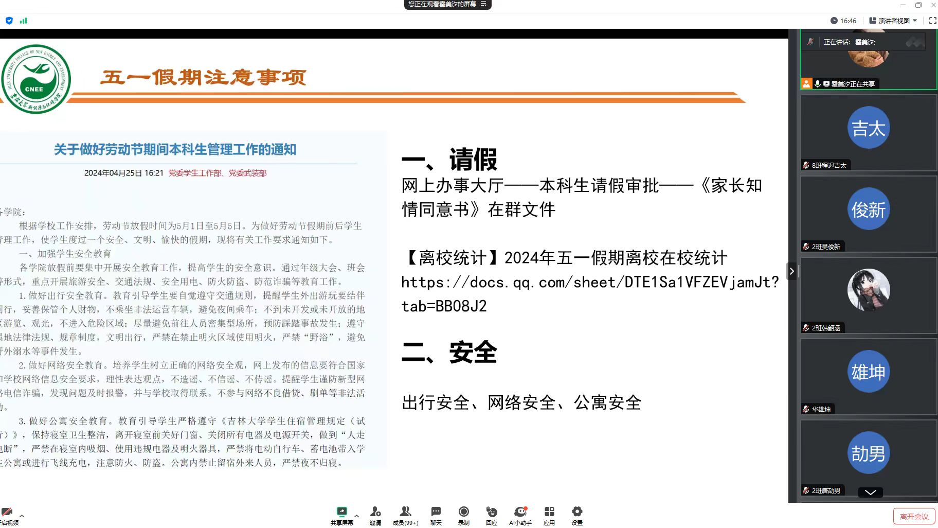 为深化员工安全意识,迎接即将到来的“五一”假期,确保员工在校及出行安全,2024年4月28日-30日,太阳集团122cc员工工作办公室全体辅导员先后组织各年级同学开展了“安全出行,礼赞劳动”主题年级大会。