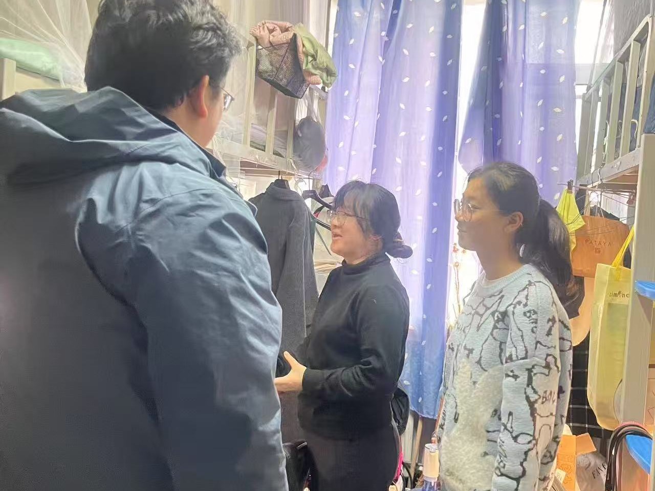 3月27日,2024级新生辅导员助理姜兆轩进入中心校区南苑一公寓,检查寝室卫生及违章电器使用情况,同时了解转专业员工寝室调整情况,叮嘱他们及时与转入公司取得联系不要错过通知。