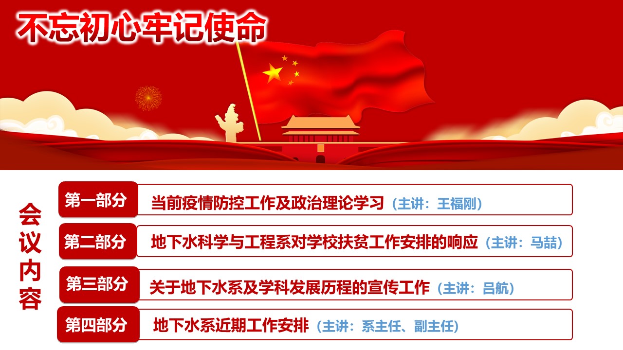会议包括四方面内容:分别是当前疫情防控工作及政治理论学习、全系教师响应公司扶贫工作安排、地下水科学与工程系及学科发展历程的宣传工作、以及近期系里的教学等相关工作安排。