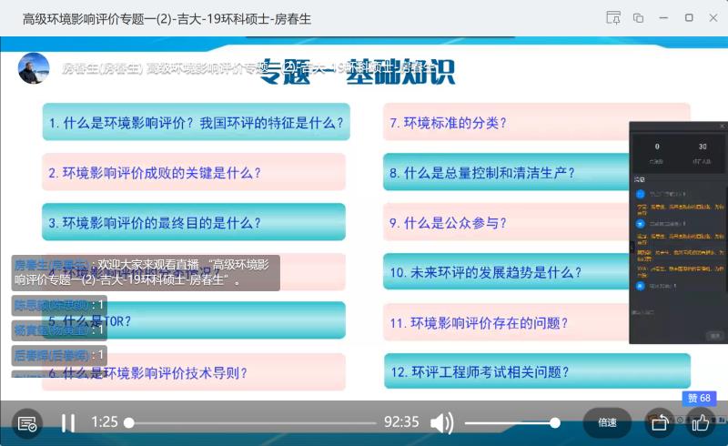在正式直播之前,房春生教授向员工推送了两次调查问卷和主题讨论,以便了解员工对于课程基础知识的掌握情况,以便确定在研究生课上讲解的重点内容。另外,还提前将员工在学习过程中需要用到的环境影响评价技术导则、环境标准等相关学习资料上传至平台文件夹内供员工参考。在正式开课的前30分钟,老师和同学们陆续进入平台系统,房春生老师在直播授课的同时和同学们进行了很好的互动,并通过直播系统的白板功能给同学们手绘图形,使得教学内容更贴近讲台,易于理解。同学们有不理解的地方能够随时留言提问,对于每一个重要的知识点老师会听取同学们是否消化理解的反馈,老师根据员工的反馈情况调整课程的深度和广度,使绝大部分同学都能够很好的吸收课堂内容。课程结束后,老师布置了课后作业任务,同学们课下进一步理解、消化、吸收。授课前后老师及时向员工推送课程公告,使员工迅速了解课程的特色和宗旨,并将授课视频分享到钉钉平台之中,可供员工无限制的回放和学习。