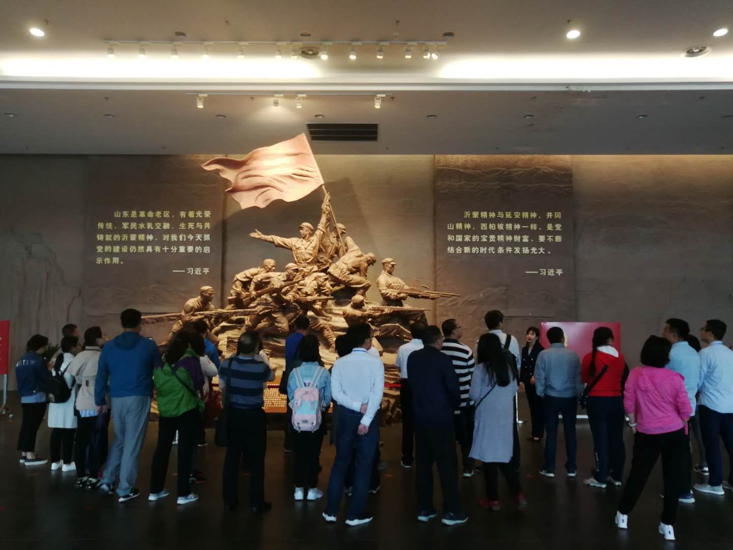 在沂蒙革命纪念馆、孟良崮战役纪念馆、大青山胜利突围纪念馆、沂蒙红嫂纪念馆、省政府旧址和八路军115师司令部旧址等教育基地,当一幅幅珍贵的照片、一个个斑驳无语的文物展现在我们眼前,我们仿佛回到了那个军民浴血奋战,前赴后继,同仇敌忾,抗击敌寇的战争年代。听着解说员的激情解说,让学员们更深刻地了解了沂蒙,了解了那个艰苦卓绝的战争年代,切身感受到沂蒙人民“爱党爱军,开拓奋进,艰苦创业,无私奉献”的精神风范。全体党员在英雄纪念碑前,庄重地举起右手,再一次重温入党誓词。在红嫂纪念馆,在讲解员的引领下,学员们走进了战火纷飞的沂蒙人民英勇支前的小山村。一个个鲜活的红嫂形象,一幅幅感人的支前场景,在每一名党员心中产生了强烈的震撼,给党员们实实在在地上了一堂爱国主义革命传统教育课。在参观的路上,学员们学唱了《跟着共产党走》、《沂蒙山小调》等民歌,歌声中,唱出了对沂蒙岁月的怀念和对沂蒙精神的赞颂。