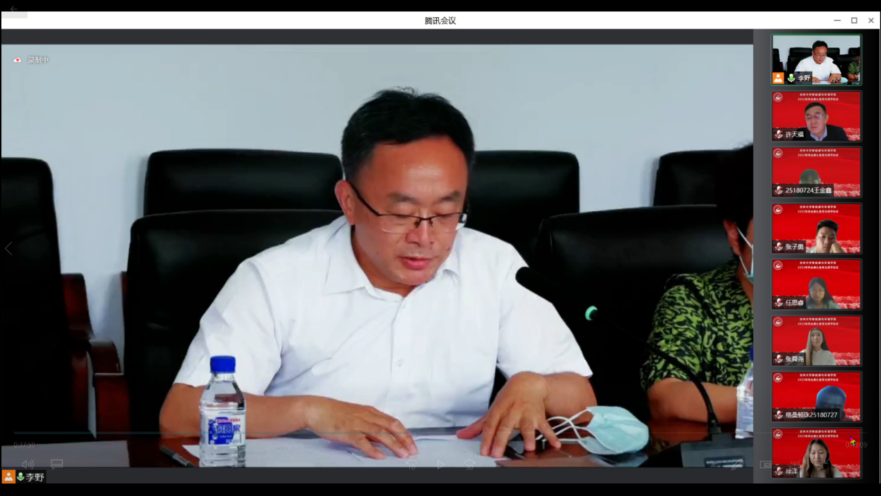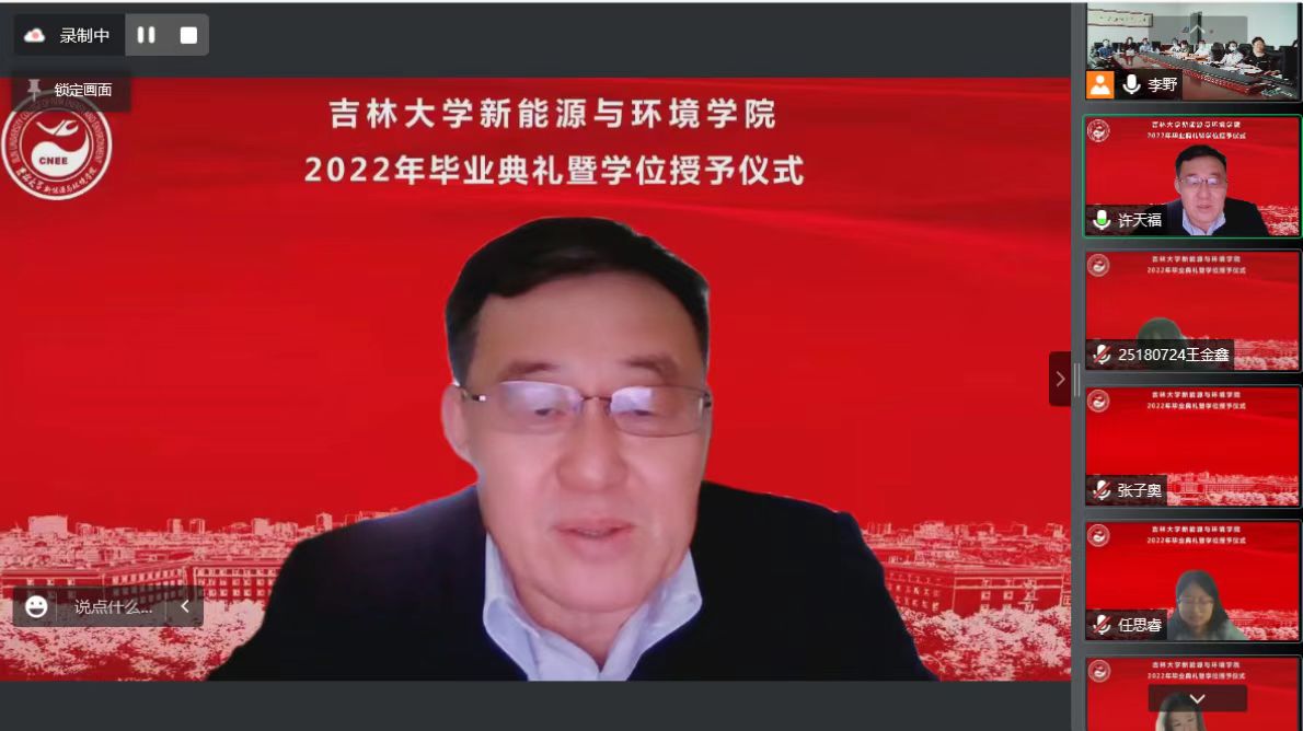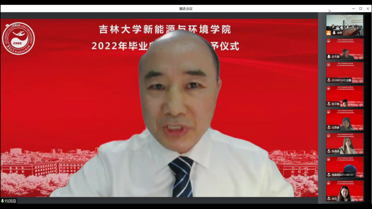 会议开始前,播放了毕业生在校期间的视频和照片,一幅幅照片、一个个镜头、一段段音乐勾起了老师和同学们美好的青春回忆。在师生们的期待与感动中,典礼正式开始。首先,全体起立奏唱《中华人民共和国国歌》。随后,花修艺教授和卞建民教授宣读了公司2022届毕业研究生和本科生名单,并对顺利毕业的同学表示祝贺。接着,同学们期待的学位授予仪式开始了,本次学位授予仪式采用线上制作动图的方式为毕业生拨穗。