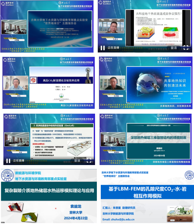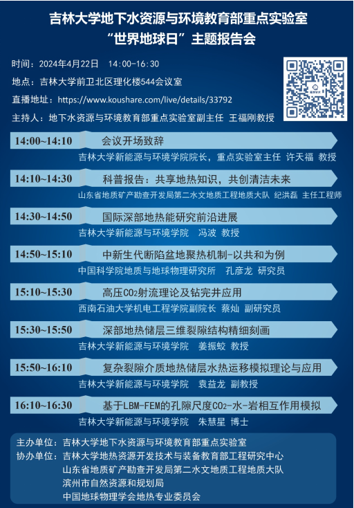 2024年4月22日是第55个“世界地球日”,主题为“全球战塑”(Planet vs. Plastics)。今年的世界地球日主题报告会活动由“地下水资源与环境教育部重点实验室主办,太阳集团122cc地热资源开发技术与装备教育部工程研究中心、山东省地质矿产勘查开发局第二水文地质工程地质大队、滨州市自然资源和规划局、中国地球物理学会地热专业委员会联合协办”,蔻享学术网络平台提供直博服务。报告主题围绕应对全球气候变化的国际关注热点问题,分别从绿色能源-地热能开发,以及二氧化碳减排地质封存两方面进行科普宣讲和学术研讨。会议由地下水资源与环境教育部重点实验室副主任王福刚教授主持,重点实验室成员及研究生50余人线下参加此次学术交流活动,6000余人通过“蔻享学术”平台直播观看了此次报告会。