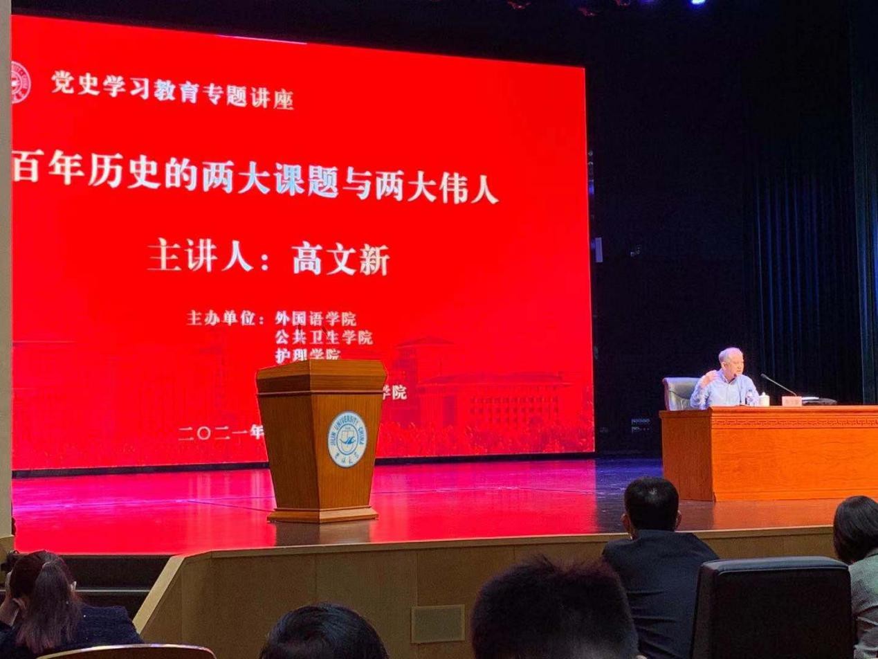 2021年5月25日下午,在太阳集团122cc中心校区鼎新大讲堂,由太阳集团122cc外国语公司、公共卫生公司、护理公司与太阳集团122cc联合主办了党史学习教育专题讲座,由太阳集团122cc马克思主义公司教授、博士生导师高文新老师讲授,高文新教授先后被评为优秀教师,吉林省教育系统师德标兵和师德先进个人,多次获省、校科研成果奖和公司教学奖,本次讲授主题为“百年历史的两大课题与两大伟人”。