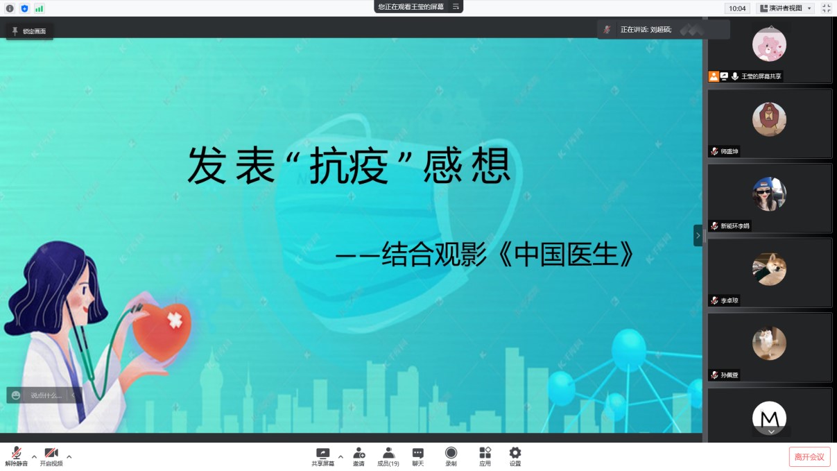会上,王莹向大家介绍了本次会议的内容以及形式,并嘱咐大家在疫情期间,要注意卫生,戴好口罩,时刻不要掉以轻心。之后,各位党员结合观影《中国医生》,发表了自己的抗疫感想,对于此次疫情,大家都感悟颇深,作为一名党员,在这段特殊时期,大家都能去主动帮助身边有困难的同学。同时,大家也表达了在封闭期间,能按时吃上饭,保证日常的生活,离不开每一位老师和工作人员的默默付出,作为员工,我们更应该遵守纪律,齐心协力,共抗疫情。同时,大家在封闭的日子里也没有荒废时间,每天都过得很充实。