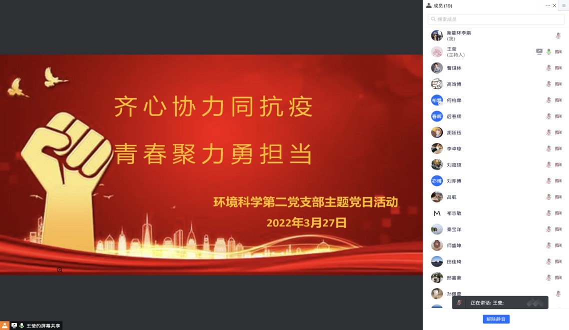 2022年3月27日下午,环境科学系研究生第二党支部召开了线上主题党日活动,此次党日活动的主题为“齐心协力同抗疫,青春聚力勇担当”。线上主题党日活动由支部书记王莹主持。